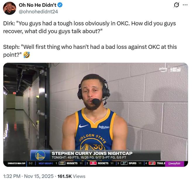 在与诺维茨基的连线中,库里也被询问你们是如何在惨败给雷霆后迅速完成心理建设与反弹?内部具体都讨论了些什么?
